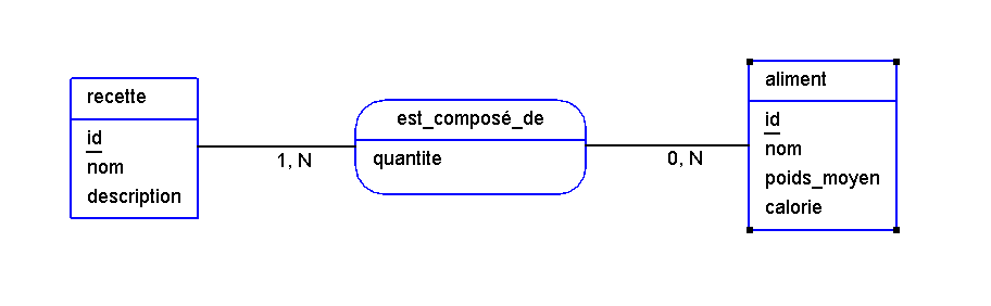Enfin créer la requête pour créer la table recette avec les bonnes relations pour que l'on puisse composer des recettes avec des aliments