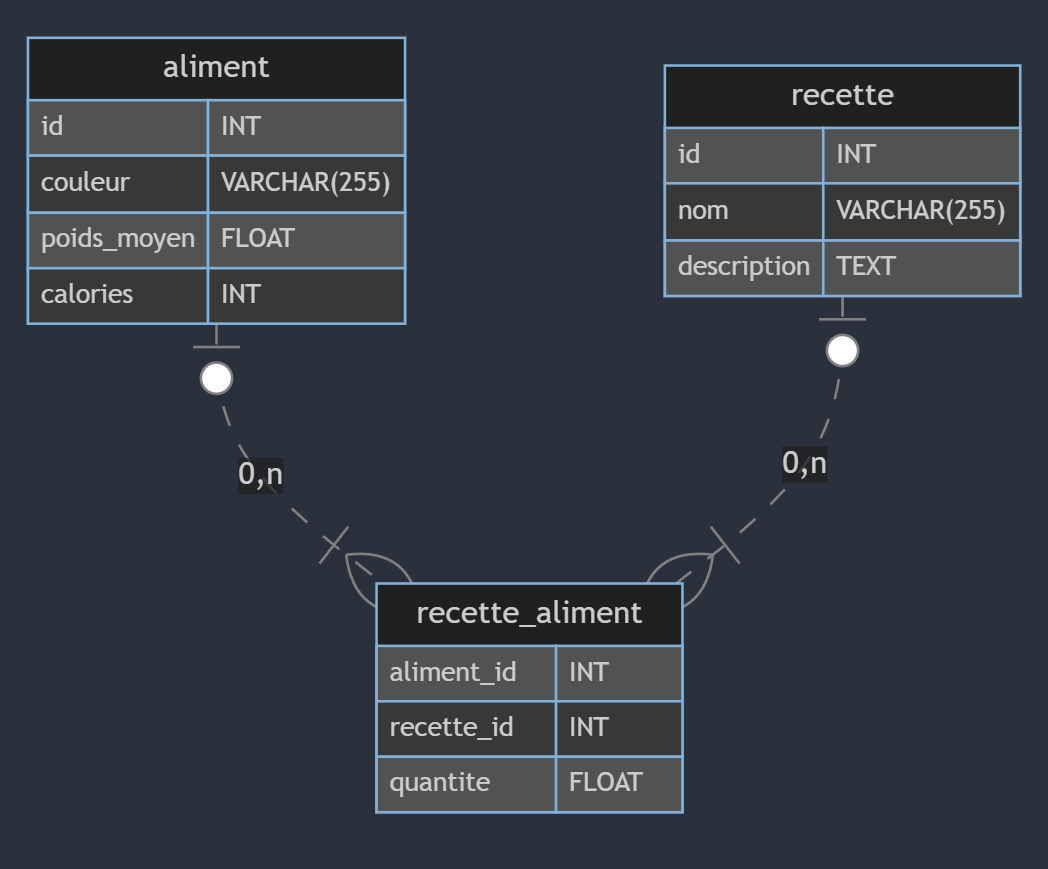 INSTRest utilisée pour vérifier si le nom de l'aliment est présent dans la description de la recette. Si c'est le cas, une correspondance est trouvée. - Cette approche peut ne pas être parfaite car elle dépend de la manière dont les aliments sont mentionnés dans la description (par exemple, les variations orthographiques ou les fautes de frappe peuvent affecter les résultats). En structurant les données dans description il y a moyen d'automatiser le remplissage de la table