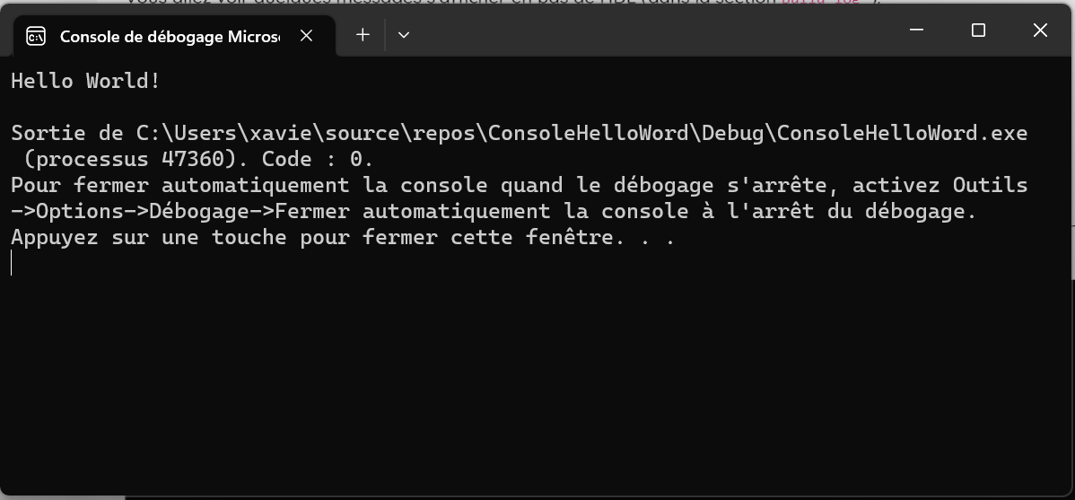 Le programme affiche "hello world !", il a été compilé et ensuite exécuté.