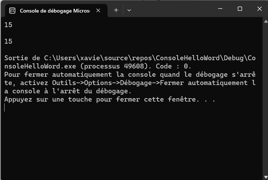 Nous affichons ensuite les valeurs de x et de y en utilisant l’objet cout. Comme y est une référence à x, les deux valeurs affichées sont les mêmes.