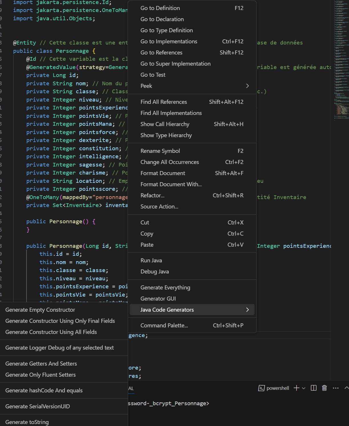 La classe Personnage est une entité JPA et peut être persistée dans une base de données. Elle utilise des annotations JPA pour définir la clé primaire (@Id) et la stratégie de génération des valeurs (@GeneratedValue). La relation entre un personnage et ses inventaires est définie en utilisant l’annotation @OneToMany.