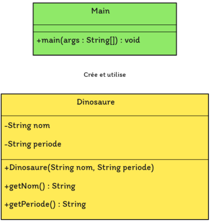 crée une classe Dinosaure avec deux attributs (nom et periode), un constructeur pour initialiser ces attributs, et deux méthodes (getNom, getPeriode). Dans la classe principale Main, un objet Dinosaure est créé et ses informations sont affichées.
