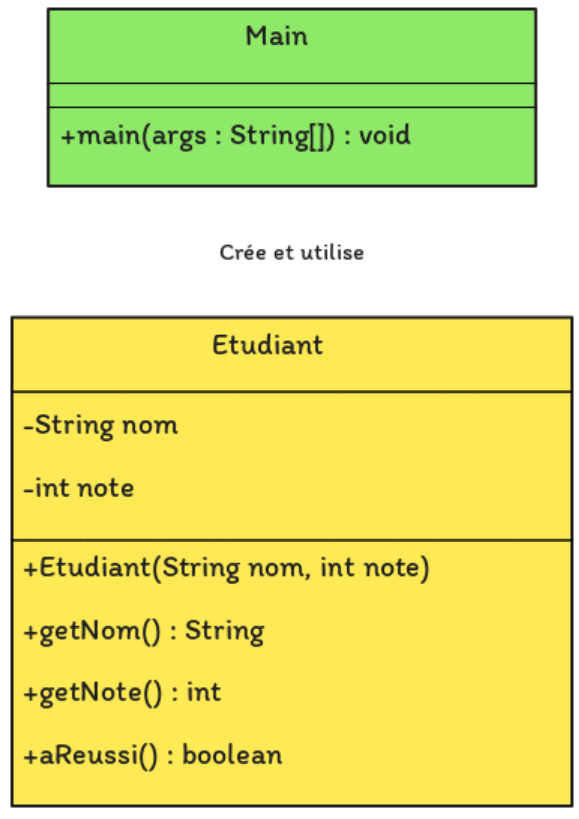 Crée une classe Etudiant avec deux attributs (nom et note), un constructeur pour initialiser ces attributs, et trois méthodes (getNom, getNote, aReussi). La méthode aReussi utilise une structure conditionnelle if-else pour déterminer si l’étudiant a réussi ou non en fonction de sa note. Enfin, dans la classe principale Main, un objet Etudiant est créé et ses informations sont affichées.