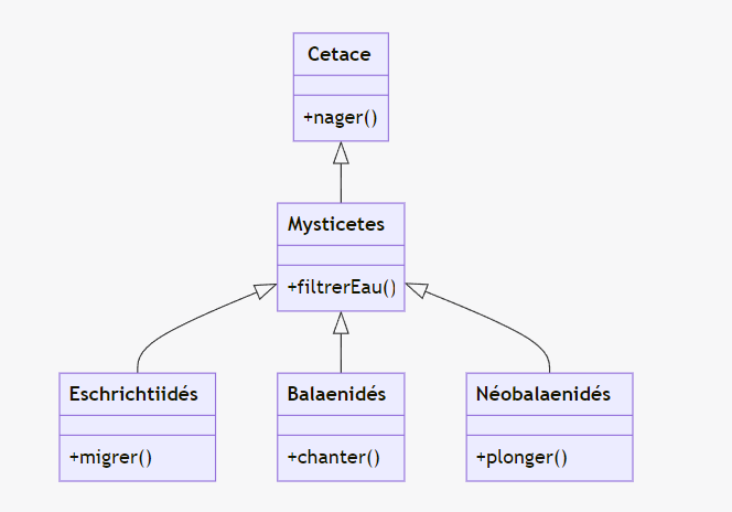 Cetaceet représente le sous-ordre des Mysticètes. Elle pourrait avoir des attributs et des méthodes spécifiques aux Mysticètes.- filtrerEau() : ex: System.out.println("Le mysticète filtre l'eau pour se nourrir...");