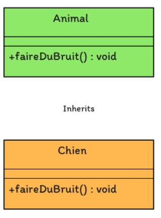 Dans cet exemple, la classe Chien hérite de la classe Animal et fournit sa propre implémentation de la méthode faireDuBruit.