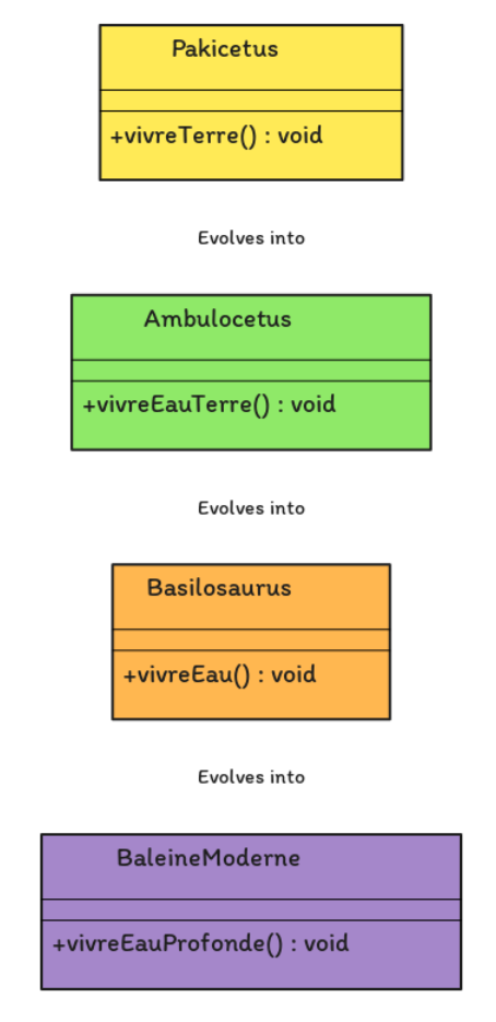 Class de l’évolution des baleines depuis le Pakicetus en utilisant le polymorphisme et l’héritage :