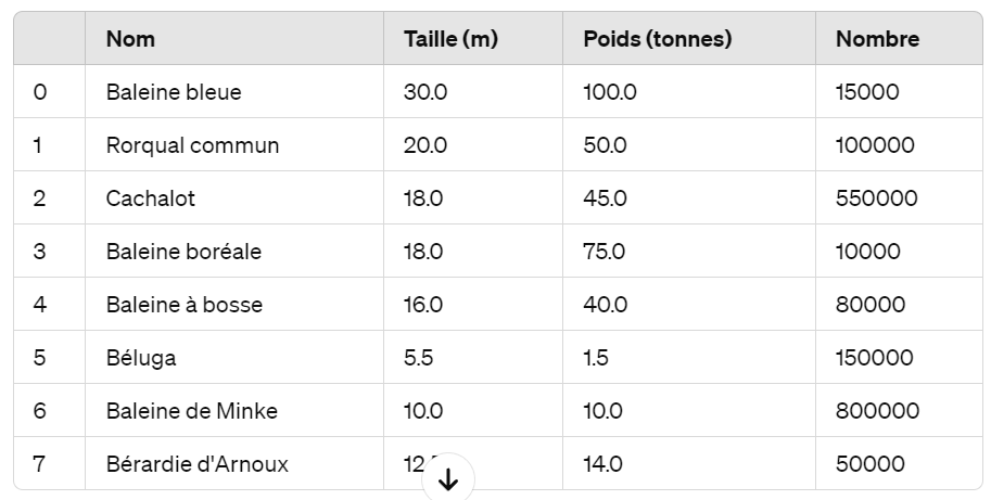 baleines.add(new Baleine("Cachalot", 18, 45, 550000)); // Les chiffres sont des estimations