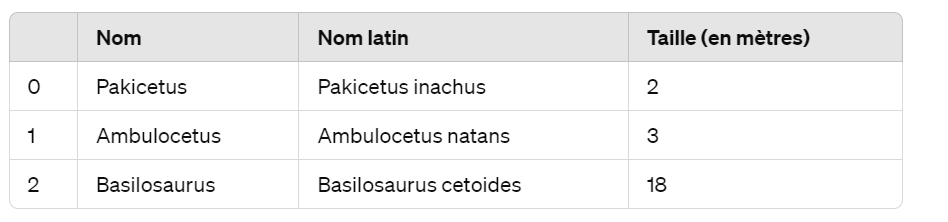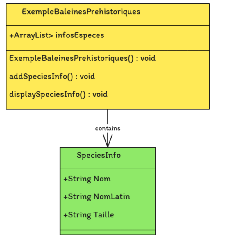 Dans cet exemple, nous avons créé trois ArrayList pour stocker les informations sur différentes espèces préhistoriques liées à l’évolution des baleines. Chaque ArrayList contient le nom de l’espèce, le nom latin et la taille de l’espèce. Ensuite, nous avons créé un autre ArrayList appelé infosEspeces pour stocker ces ArrayList. Enfin, nous avons parcouru tous les éléments de la liste infosEspeces en utilisant une boucle for-each et affiché les informations sur chaque espèce.