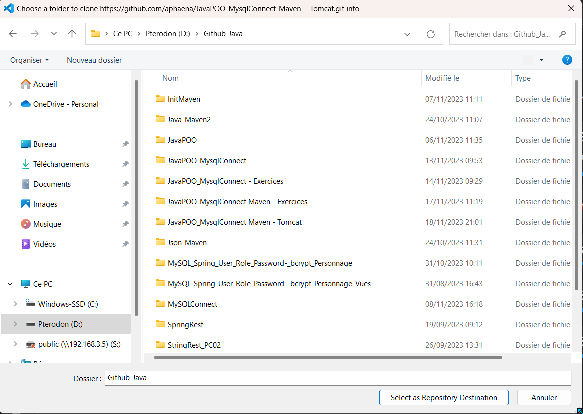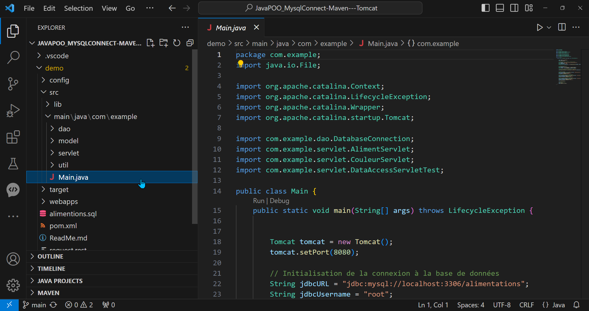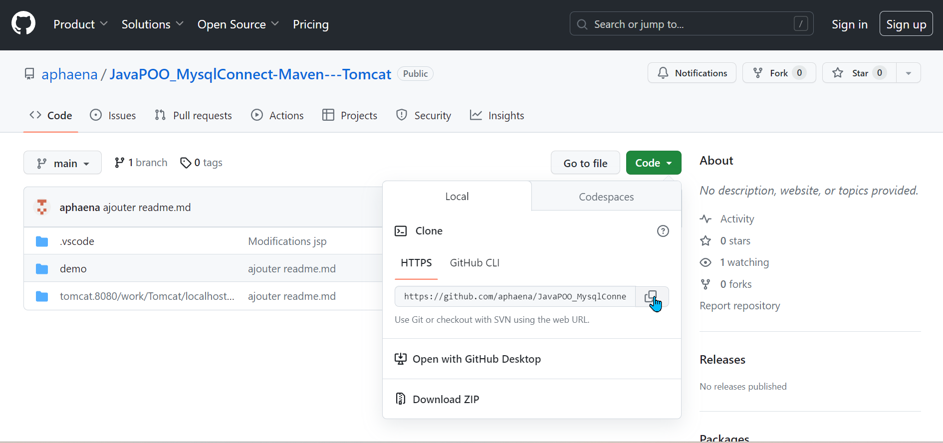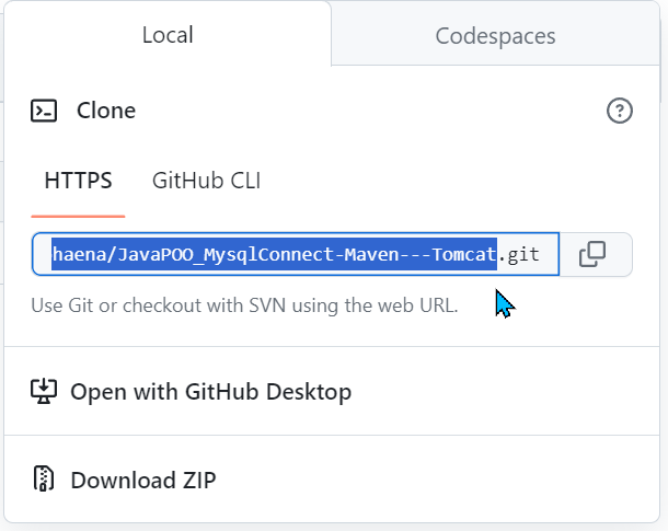 - Clonez le dépôt ou téléchargez le code source. https://github.com/aphaena/JavaPOO_MysqlConnect-Maven---Tomcat.git