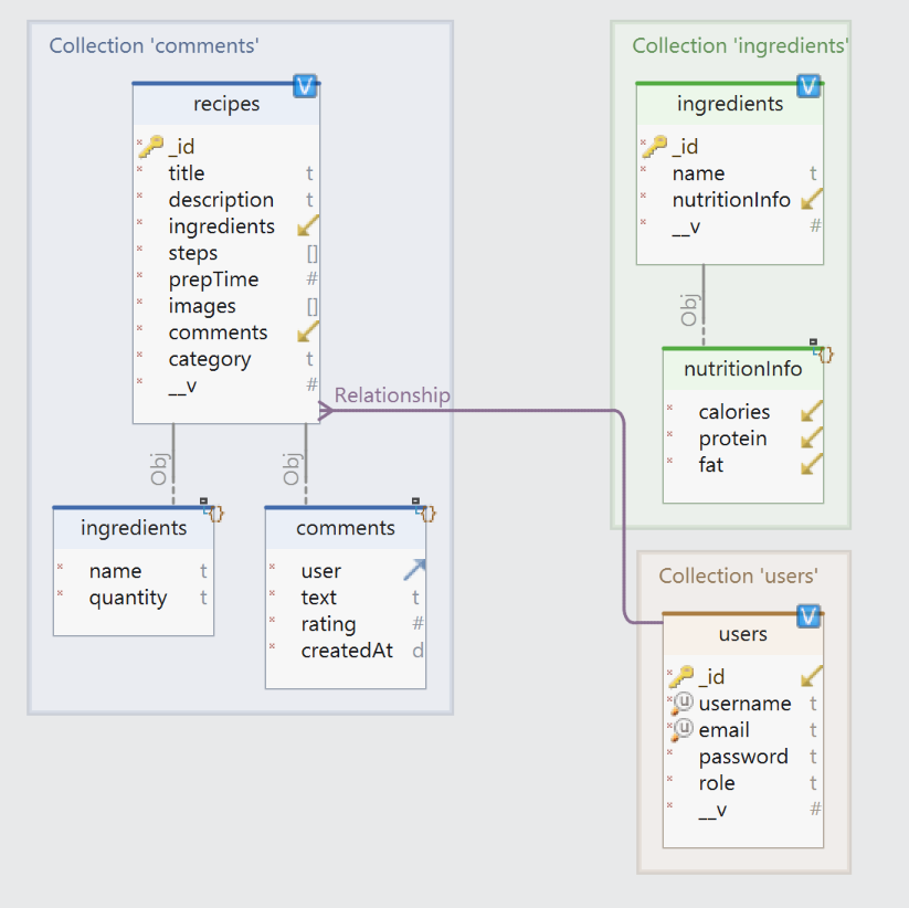 Recipes: Contient des recettes, y compris des détails comme les ingrédients et les étapes de préparation. Vous pouvez inclure une référence àUserspour l'auteur de la recette. - Collection