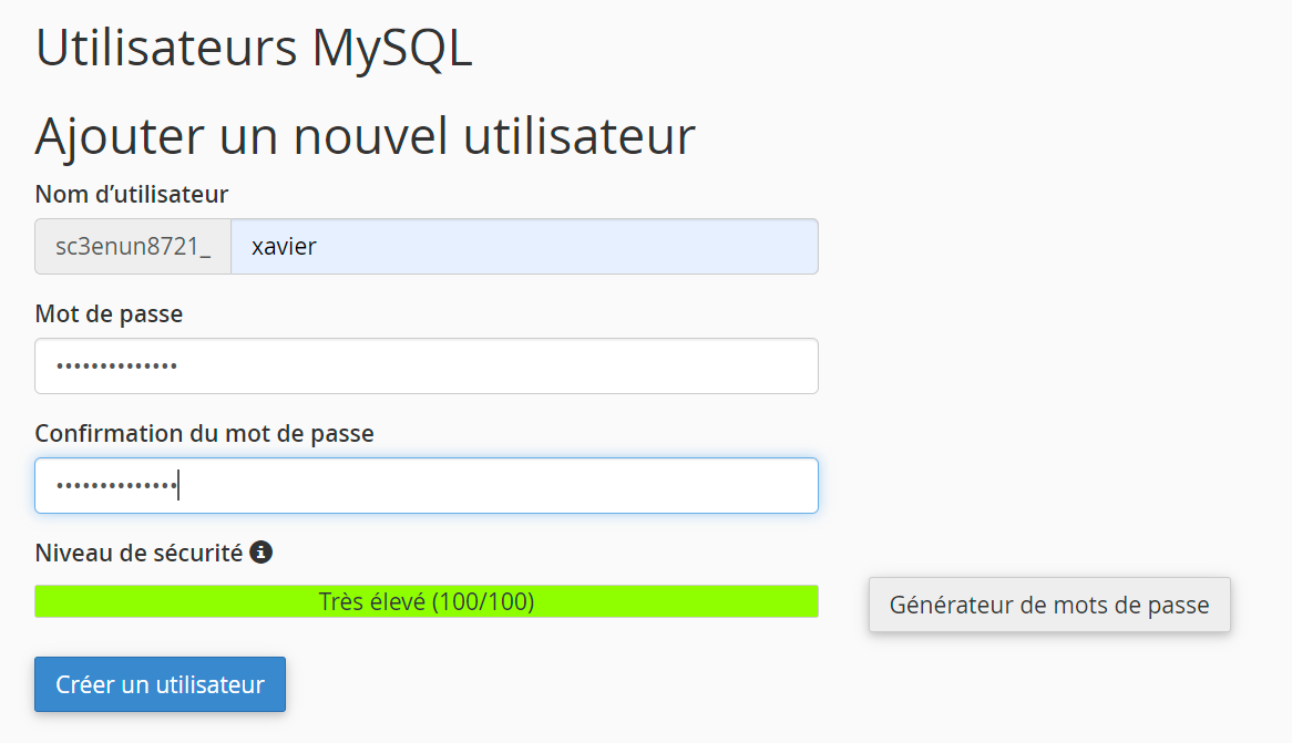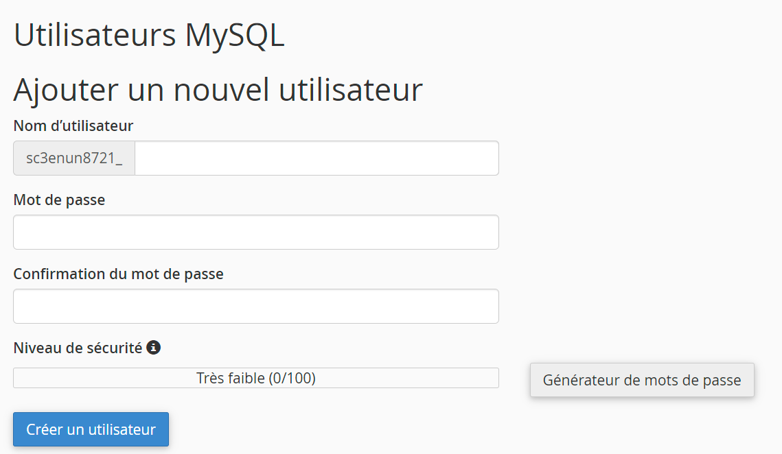 - Création d'un Utilisateur : Dans la même section, créez un utilisateur MySQL, notez bien le nom d'utilisateur et le mot de passe.