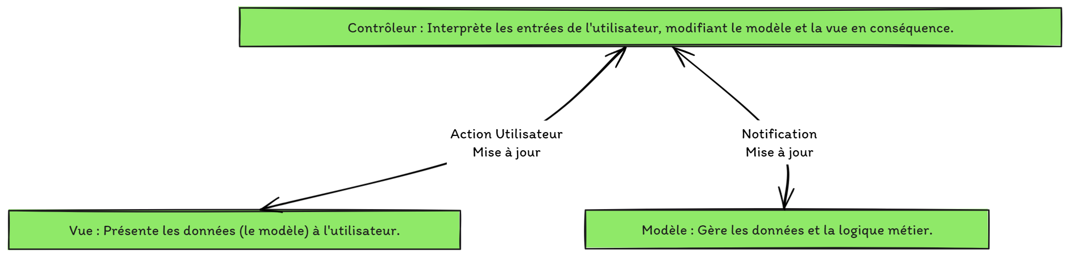 - Controller : Interprète les entrées de l'utilisateur, modifiant le modèle et la vue en conséquence.