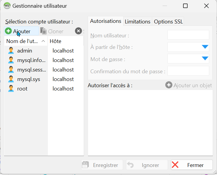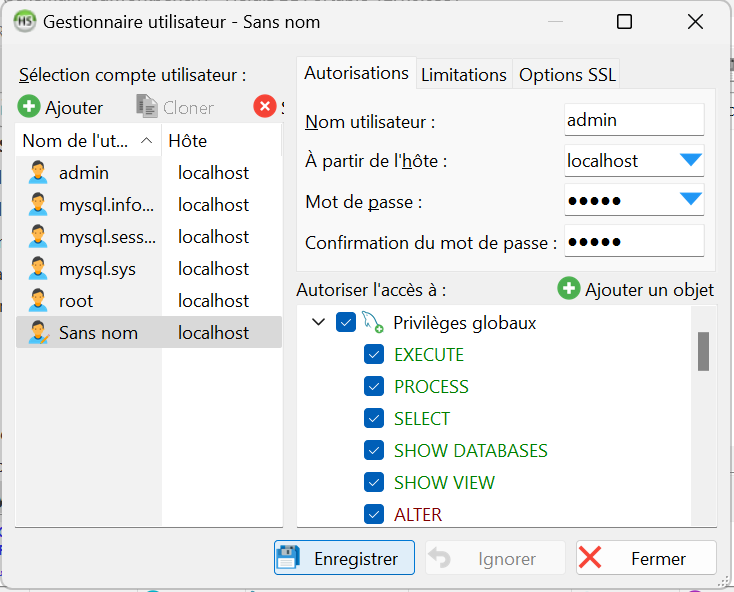 N'oubliez pas de selectionner la checkbox Privilèges Globaux