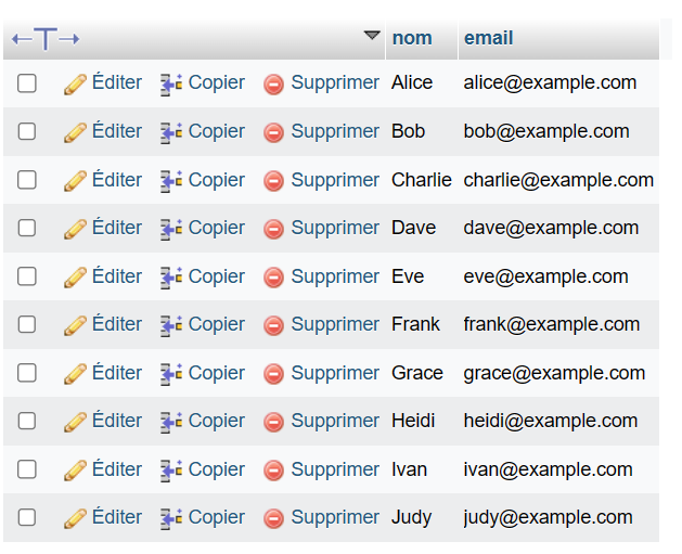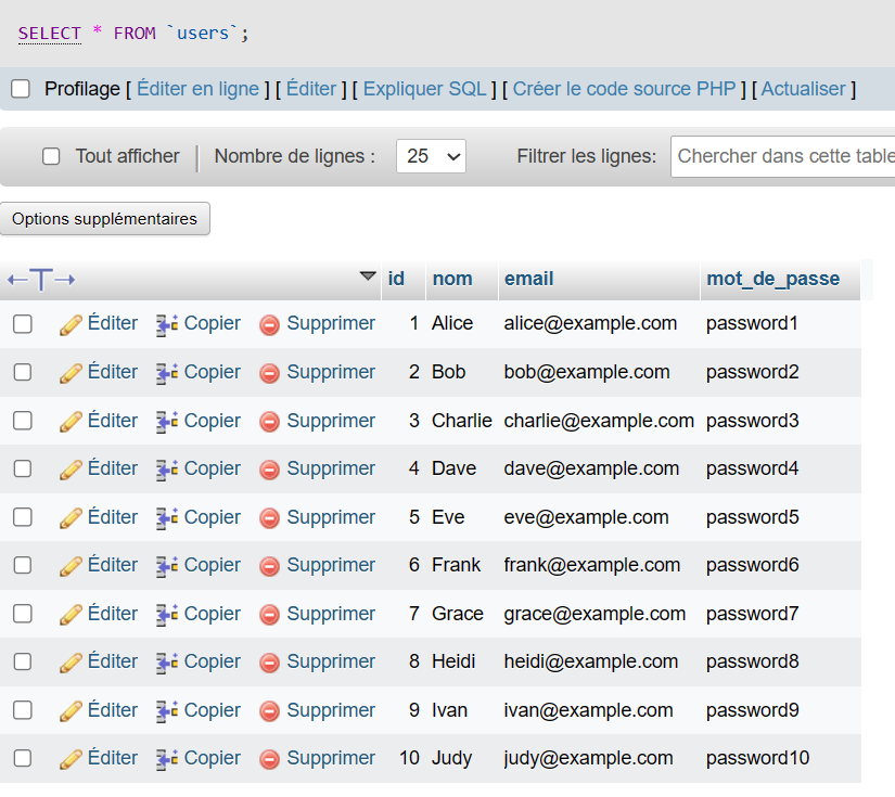 Pour lire toutes les données de la table users, vous pouvez utiliser la commande SELECT avec l’astérisque (*) pour sélectionner toutes les colonnes. Voici un exemple de code MySQL qui lit toutes les données de la table users :